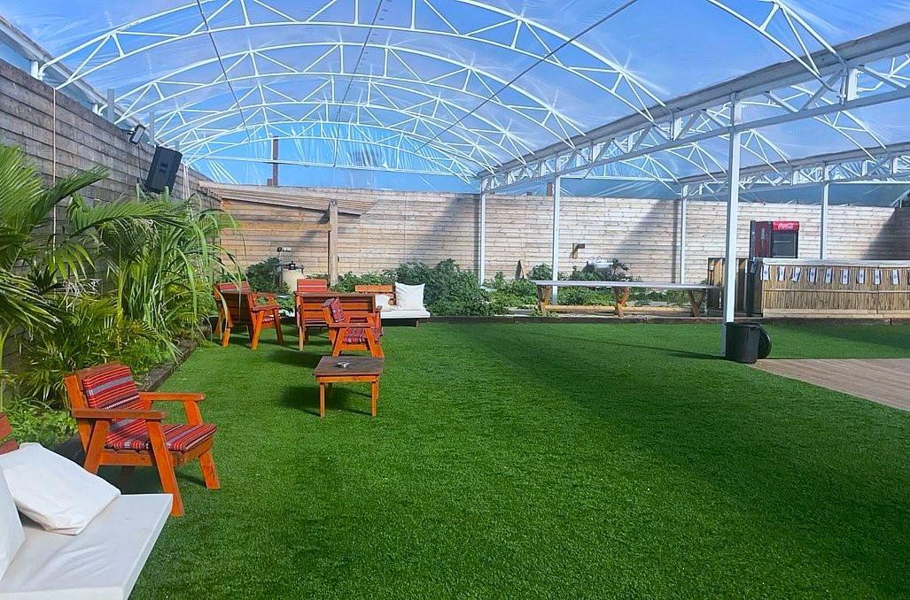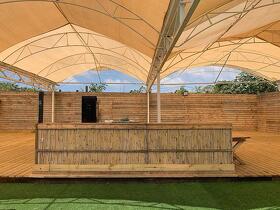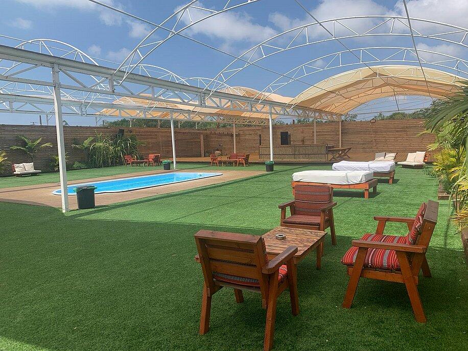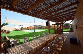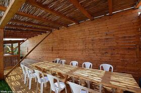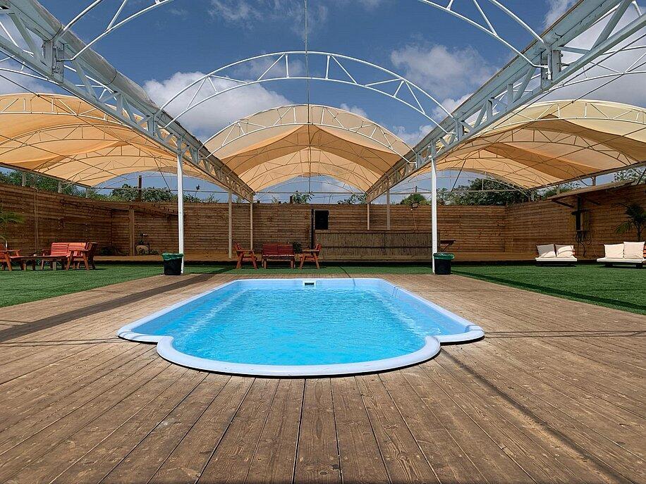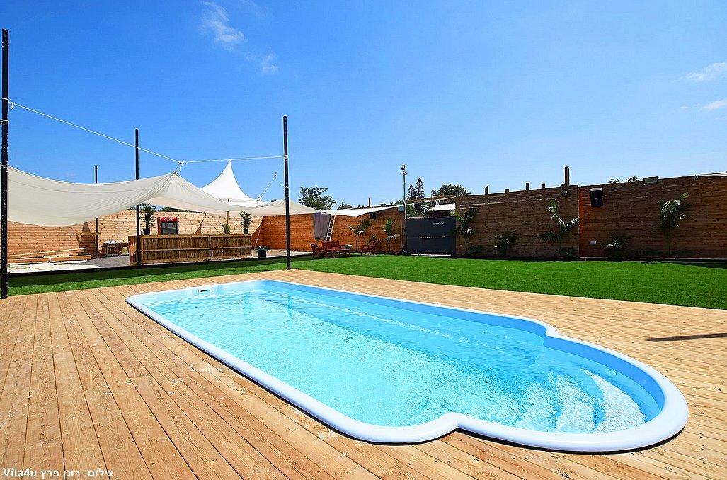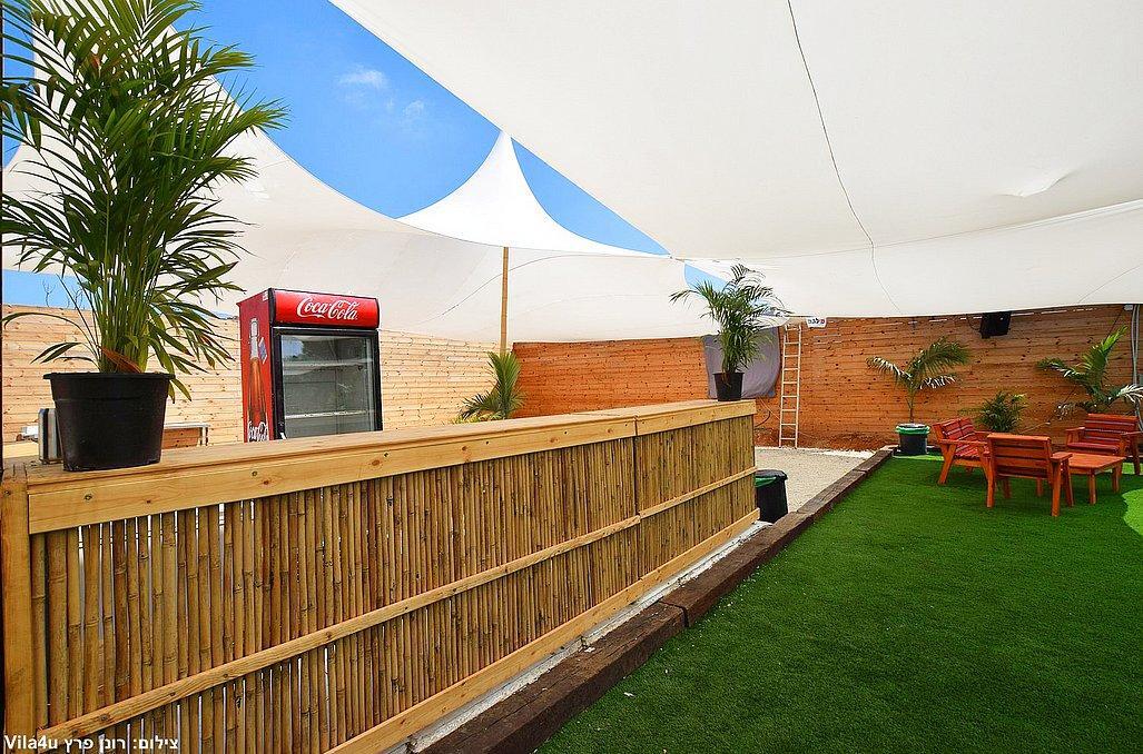 מתחם ענק ויפיפיה, הכולל מתחם דשא גדול עם המון פינות ישיבה, בריכת שחייה, בר שתייה, עמדת DJ, ועמדת מנגל הכוללת משטח עבודה, מקפיא, מקרר וכיור. בנוסף קיימים 3 תאי שירותים נקיים.