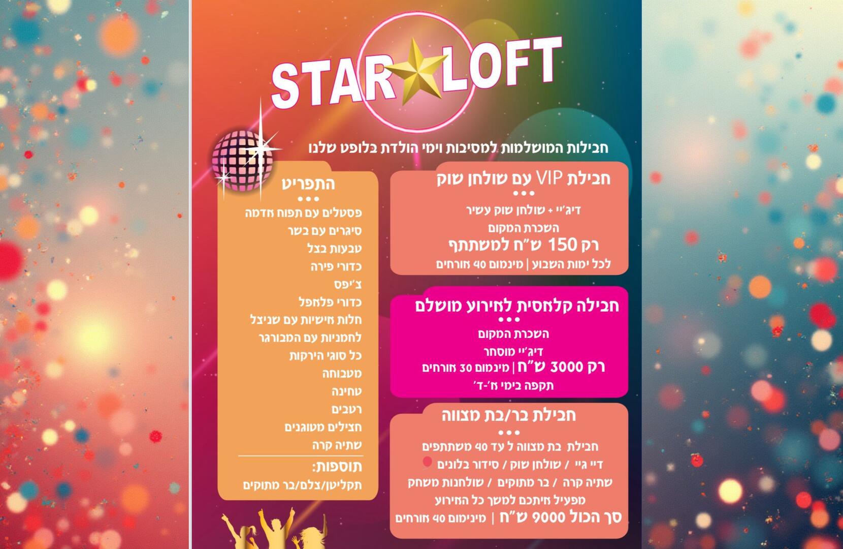 מחפשים לערוך מסיבה באזור בת ים? סטאר לופט הוא המקום בשבילכם! כאן, תוכלו לחגוג בלי לדאוג מהגבלות רעש. בסטאר לופט ישנו שולחן סנוקר, שפע של פינות ישיבה ושולחנות, מערכת סאונד מקצועית, ותאורה משוכללת , סוני פלייסטיישן ועוד מגוון אטרקציות כיפיות ליהנות מהן. הלופט שלנו יכול להכיל עד 100 אורחים, מה שהופך אותו למושלם לכל מיני אירועים כמו הצעות נישואין, ימי הולדת, מפגשים חברתיים, מסיבות ילדים ועוד. בואו לחגוג איתנו בסטאר לופט שבבת ים ולהפוך את האירוע שלכם לבלתי נשכח!